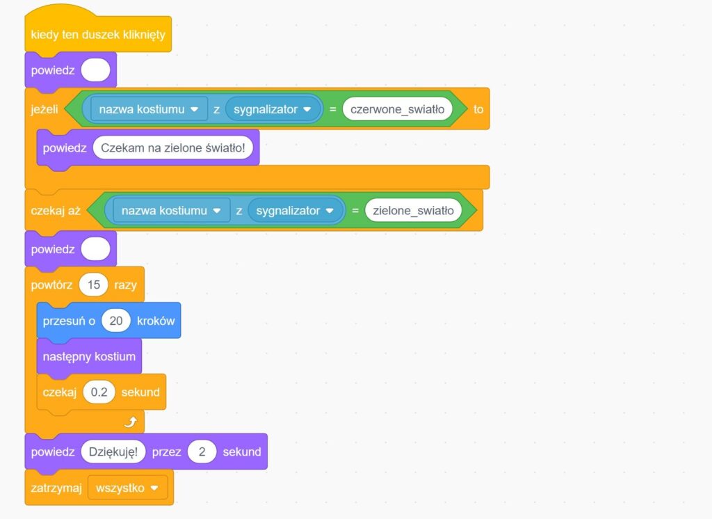 - Bloki kodu – klocki z instrukcjami, które przeciągasz, aby sterować postaciami. Są podzielone na kategorie, np. ruch, wygląd, dźwięk, zdarzenia, kontrola.