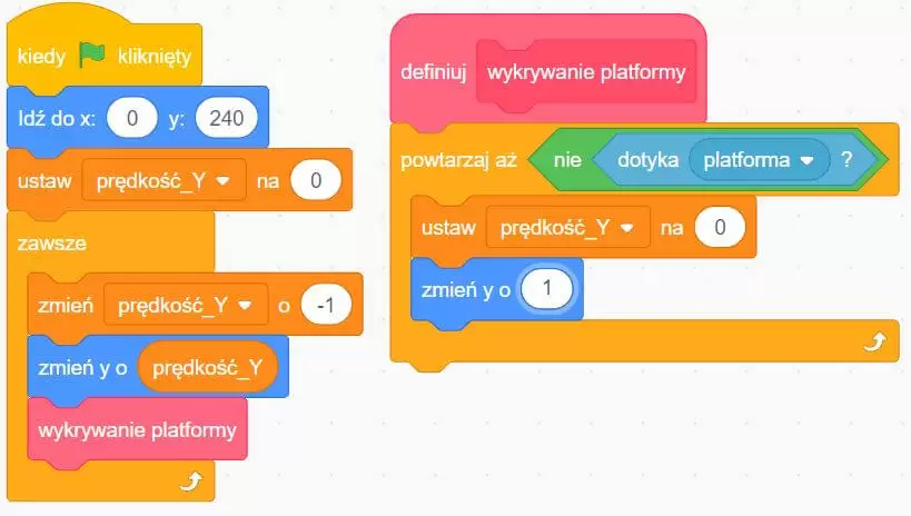 - Dodaj kod, który wykrywa kolizję między bohaterem a przeszkodą. Możesz np. napisać: „Jeśli dotknie przeszkody, zacznij od nowa” lub „Stracisz życie”.