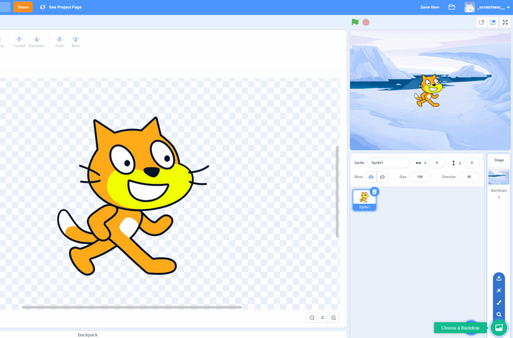 Na początek wybierz jednego bohatera (np. kota Scratcha) i tło sceny (np. park, kosmos, miasto). To Twoja przestrzeń do eksperymentów. Możesz zmieniać kolory, dodawać kilka postaci i stworzyć ciekawy świat gry.